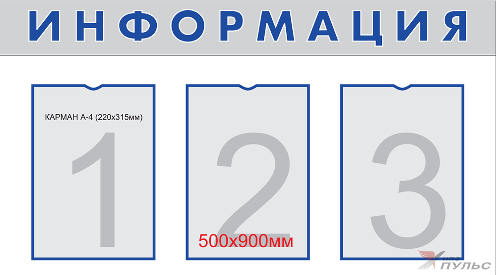 Стенд информационный 900х500мм “ИНФОРМАЦИЯ” на пластике с 3-мя карманами А4 НПО "Пульс"