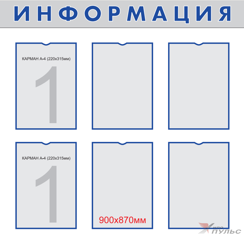 Стенд информационный 900х870мм “ИНФОРМАЦИЯ” на пластике с 6-ю карманами А4 НПО "Пульс"