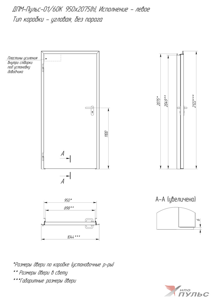 Монтаж двери противопожарной металлической ДПМ-Пульс-01/60К сплошная, угловая коробка (950х2075), без порога, левая, RAL9016 должен производиться специализированными организациями, имеющими лицензию на проведение данного вида работ.